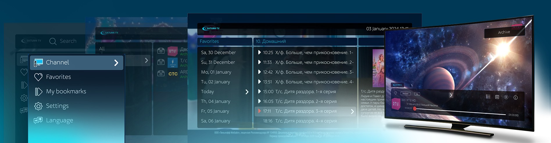 Приложение Сатурн ТВ можно найти в маркетах Google Play, Samsung, LG. Если у вас другая платформа, свяжитесь с техподдержкой. Скачайте приложение, авторизуйтесь и смотрите все каналы в отличном качестве.